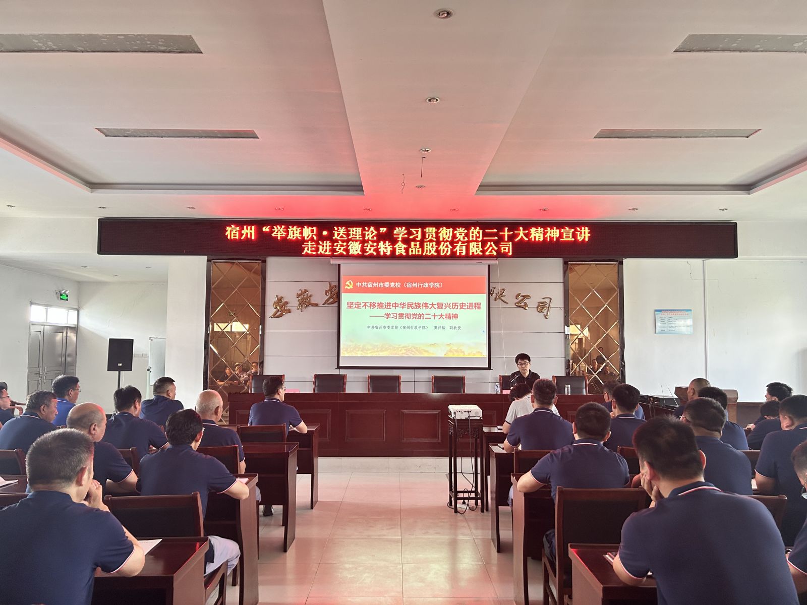 8月11日下午,宿州“舉旗幟·送理論”學(xué)習(xí)貫徹黨的二十大精神基層宣講報(bào)告會(huì)在安徽安特食品股份有限公司電教室召開(kāi)。市委黨校理論研究室主任、副教授竇祥銘作專(zhuān)題宣講,市經(jīng)開(kāi)區(qū)四級(jí)調(diào)研員、非公黨委副書(shū)記王浩主持會(huì)議。