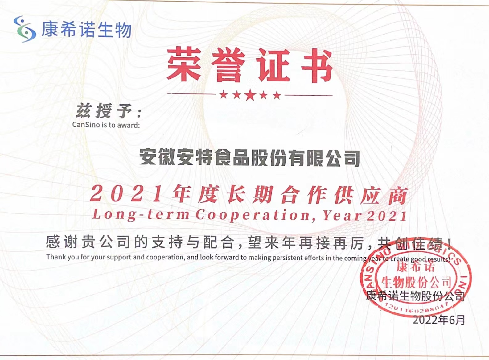 今天,我們收到一份康希諾生物頒發的榮譽證書,授予我司“2021年付長期合作供應商”榮譽稱號。