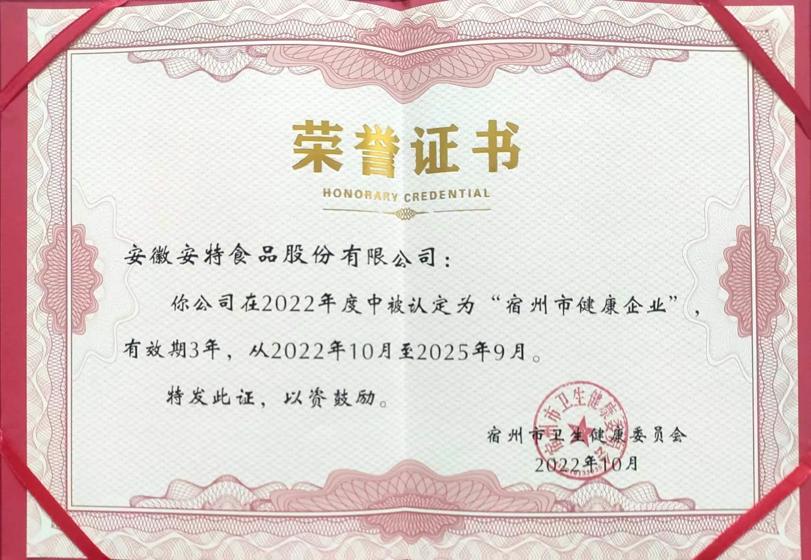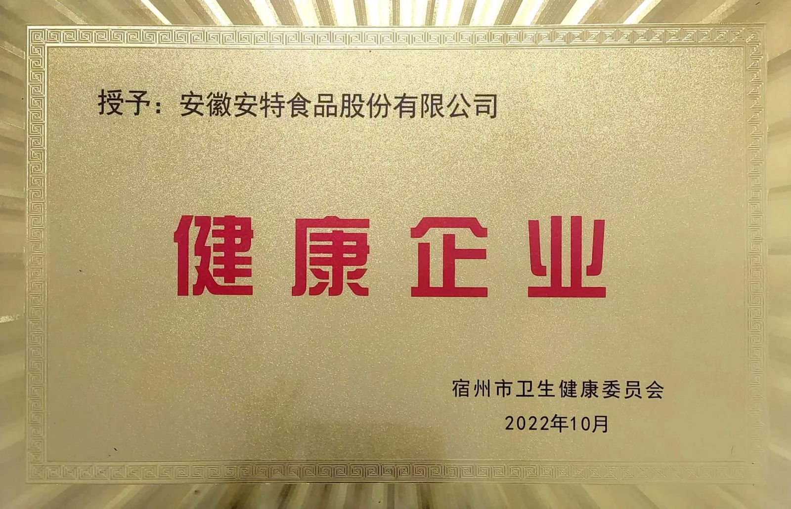 祝賀我司榮獲“宿州市健康企業”稱號